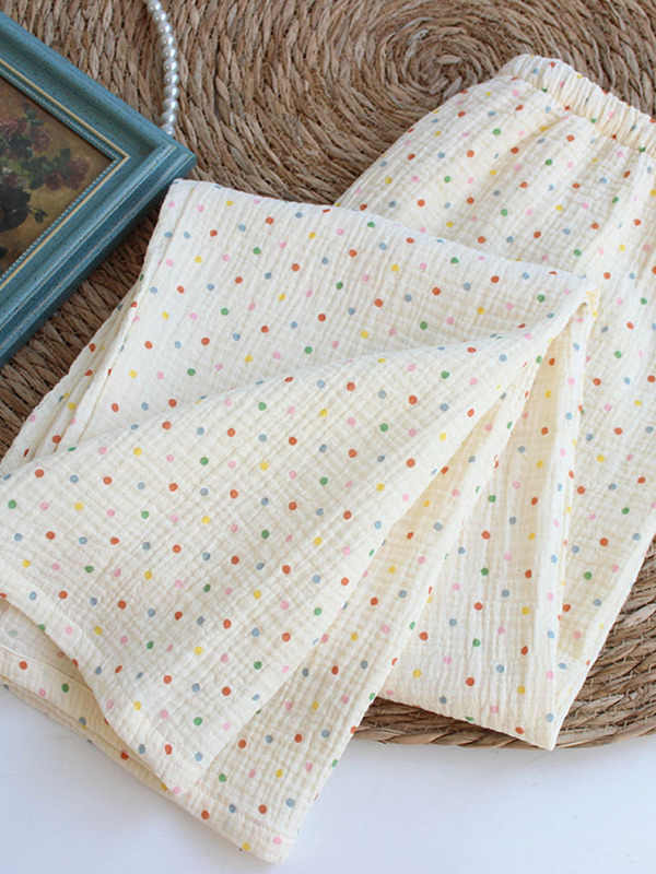 The set includes a short-sleeved top, matching long pants, and a coordinating layer, perfect for lounging or sleeping. Its beige colour with delicate dots adds a touch of elegance and freshness to your daily comfort wear.